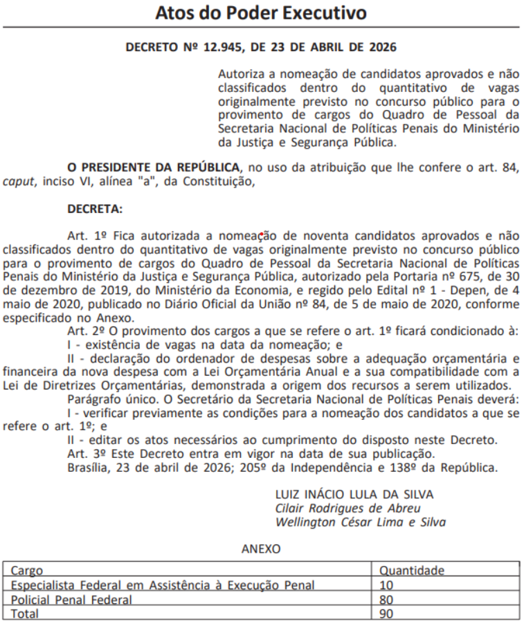 O governo federal publicou nesta sexta-feira, 24 de abril de 2026, no Diário Oficial da União (DOU), o decreto que autoriza a nomeação de 90 candidatos aprovados no concurso Senappen (Secretaria Nacional de Políticas Penais), vinculada ao Ministério da Justiça e Segurança Pública.