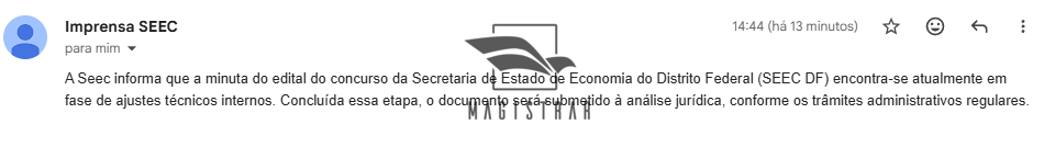 A Secretaria de Estado de Economia do Distrito Federal (SEEC DF) confirmou à equipe do Magistrar que a minuta do edital do próximo concurso público para Auditor Fiscal da Receita está em fase de ajustes técnicos internos. Concluída essa etapa, o documento será submetido à análise jurídica, conforme os trâmites administrativos regulares.
