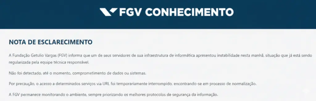 Em nota publicada em seu site oficial, a FGV se manifestou sobre o ocorrido: