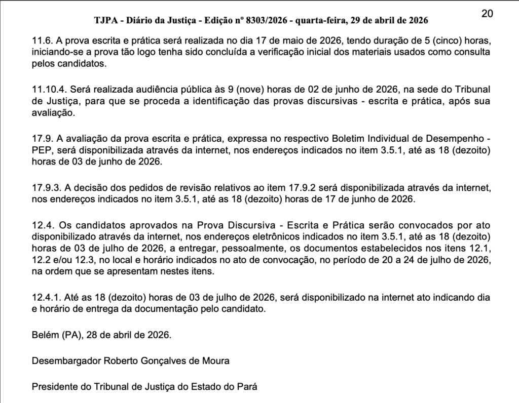 A retificação foi publicada no Diário da Justiça Eletrônico em 29 de abril de 2026, assinada pelo presidente do TJPA, desembargador Roberto Gonçalves de Moura.