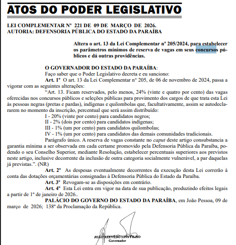 A lei estabelece que esses percentuais são a garantia mínima a ser observada em cada certame promovido pela Defensoria. Isso significa que o Conselho Superior da DPE-PB poderá, por meio de resolução, estabelecer percentuais ainda superiores ou incluir outras categorias socialmente vulneráveis .