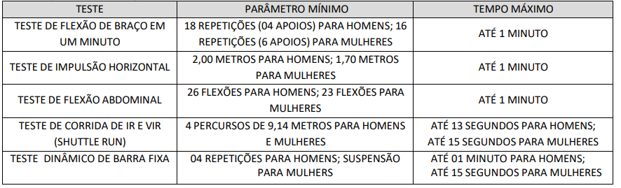 Os índices exigidos variam conforme o sexo do candidato e devem ser cumpridos integralmente para aprovação na etapa.