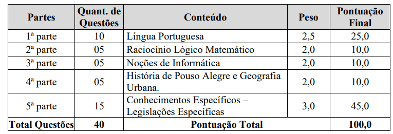 A prova objetiva corresponde à primeira etapa do concurso da GCM Pouso Alegre e possui caráter eliminatório e classificatório. Essa fase é responsável por avaliar os conhecimentos teóricos dos candidatos, sendo decisiva para a continuidade nas demais etapas do certame.