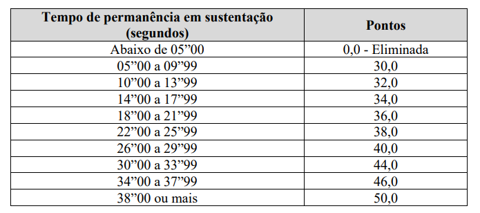 A candidata deve se manter suspensa na barra com o queixo acima dela pelo maior tempo possível.