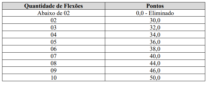 O candidato deve realizar flexões completas na barra fixa, com as seguintes regras: