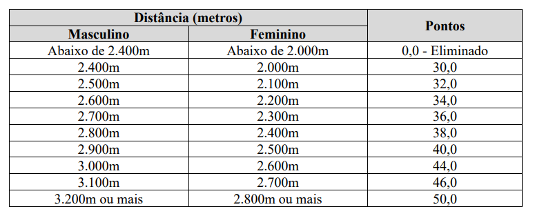 Teste de resistência aeróbica para ambos os sexos, com duração fixa de 12 minutos.