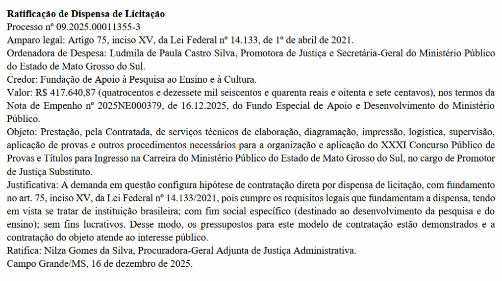 O XXXI Concurso Público para Promotor de Justiça do MP MS avançou em etapas importantes da sua organização. A Fundação de Apoio à Pesquisa, ao Ensino e à Cultura (FAPEC) foi oficialmente definida como banca organizadora, com contratação realizada por dispensa de licitação.
