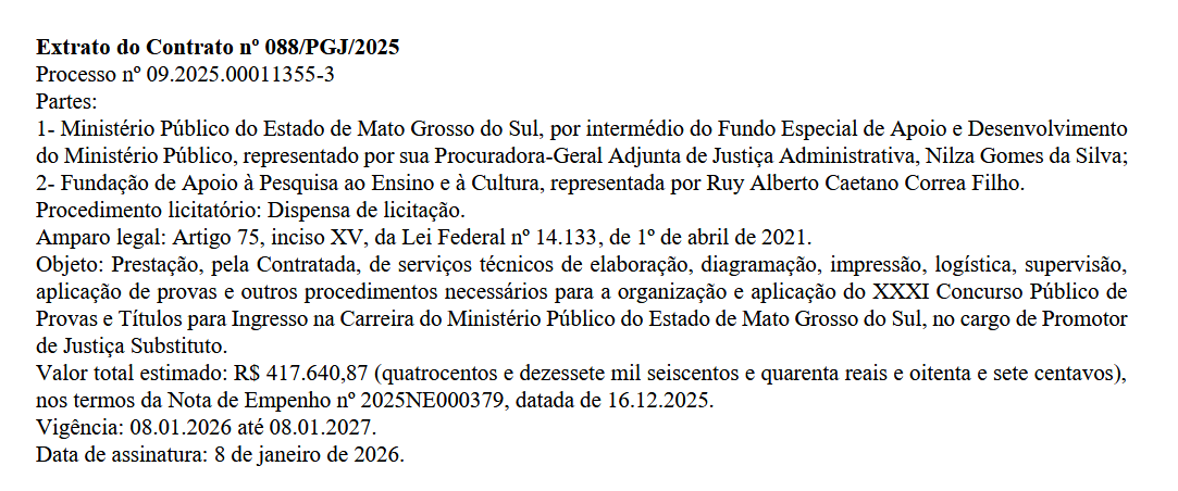 O XXXI Concurso Público para Promotor de Justiça do MP MS avançou em etapas importantes da sua organização. A Fundação de Apoio à Pesquisa, ao Ensino e à Cultura (FAPEC) foi oficialmente definida como banca organizadora, com contratação realizada por dispensa de licitação.