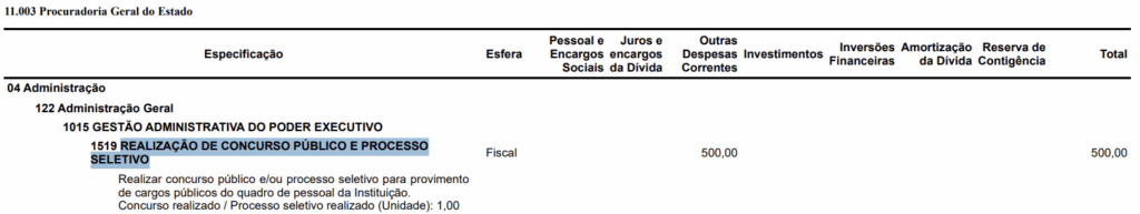 A Lei Orçamentária Anual (LOA) de Rondônia para o exercício de 2026 foi publicada e trouxe um indicativo relevante para os interessados no Concurso da Procuradoria Geral do Estado de Rondônia (PGE RO) para Procurador. O documento prevê dotação destinada à Procuradoria-Geral do Estado, demonstrando a existência de recursos reservados ao órgão.