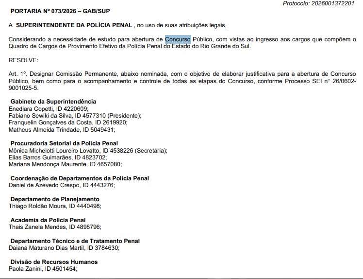 Além disso, a Superintendência da Polícia Penal do Rio Grande do Sul (RS) publicou, na quarta-feira (4/2), em Diário Oficial do estado, a Portaria nº 073/2026, que designa uma Comissão Permanente responsável por toda a elaboração, justificativa e acompanhamento das etapas de um novo Concurso Público para a instituição. A medida foi o primeiro passo administrativo concreto rumo à publicação do tão aguardado edital.