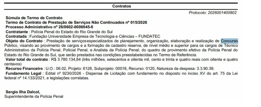 O concurso da Polícia Penal do Rio Grande do Sul deu mais um passo importante rumo à publicação do edital. Foi divulgada no Diário Oficial do Estado a súmula de contrato que oficializa a Fundatec como banca organizadora do certame. Com isso, a seleção, que contará com 3 mil vagas, fica ainda mais próxima de ser lançada.