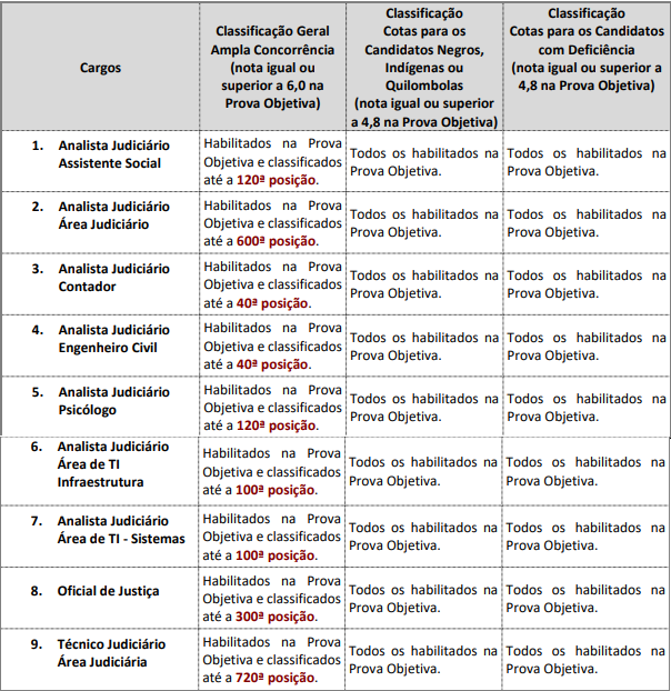 • Serão corrigidas as redações dos candidatos habilitados na objetiva, dentro de um quantitativo pré-definido por cargo (ex.: até 600º lugar para Analista Judiciário – Área Judiciária; até 720º para Técnico Judiciário).