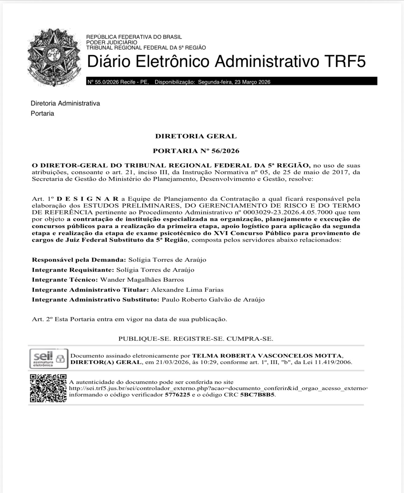 Na sequência, o Tribunal publicou o Ato nº 41/2026, que designou a Comissão Examinadora do XVI Concurso para Juiz Federal Substituto da 5ª Região.