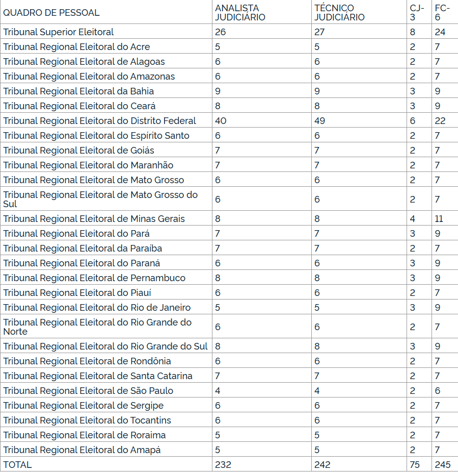 Entre os regionais, o TRE do Distrito Federal foi o mais contemplado, com 40 vagas de Analista e 49 de Técnico Judiciário. Na outra ponta, o TRE de São Paulo recebeu o menor contingente: 4 vagas para cada cargo.