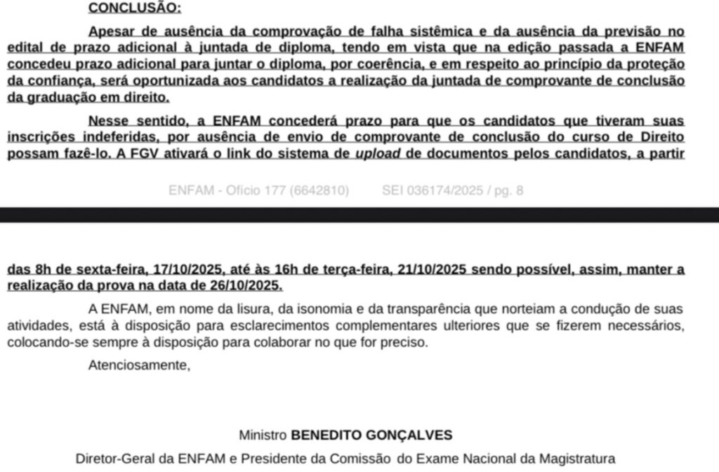 Segundo o documento, não foi identificada falha sistêmica no sistema da FGV e o edital não previa a reabertura de prazos antes do dia da prova do Enam. Mesmo assim, a Enfam decidiu conceder uma nova oportunidade “por coerência e em respeito ao princípio da proteção da confiança”.