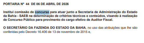 A Secretaria da Fazenda do Estado da Bahia formalizou a constituição de duas comissões organizadoras para coordenar o concurso SEFAZ-BA que oferecerá aproximadamente 200 vagas para os cargos de Auditor Fiscal e Agente de Tributos Estaduais.